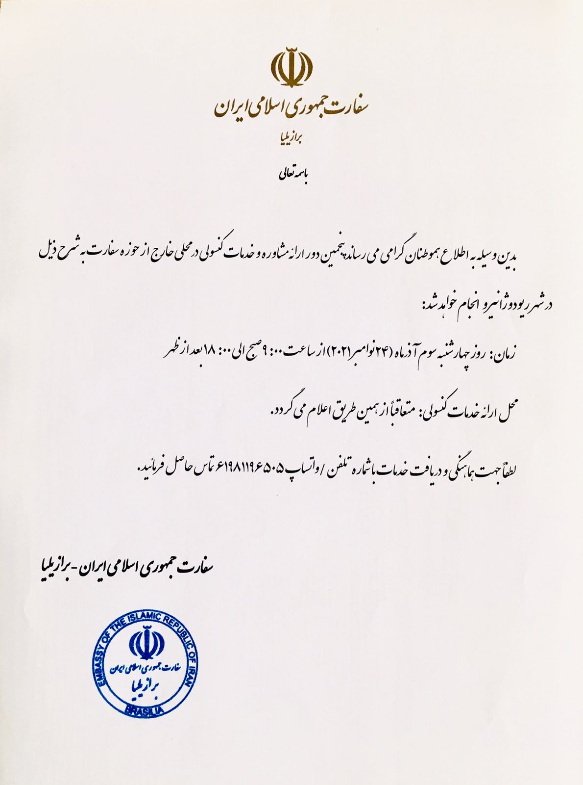 پنجمین دور ارائه مشاوره و خدمات کنسولی خارج از برازیلیا در شهر ریو دو ژانیرو به ایرانیان و هموطنان گرامی در روز چهارشنبه مورخ سوم آذرماه (24 نوامبر 2021) فراهم گردید.