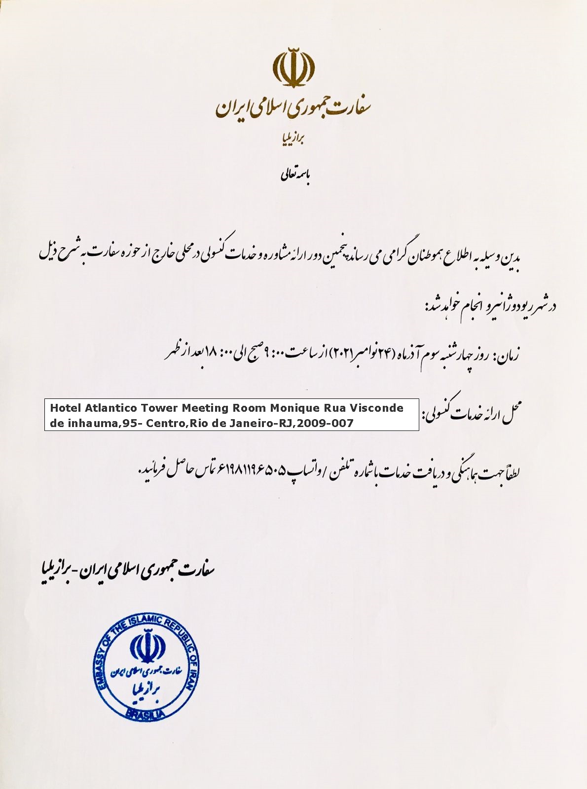 پنجمین دور ارائه مشاوره و خدمات کنسولی خارج از برازیلیا در شهر ریو دو ژانیرو به ایرانیان و هموطنان گرامی در روز چهارشنبه مورخ سوم آذرماه (24 نوامبر 2021) انجام میگردد.