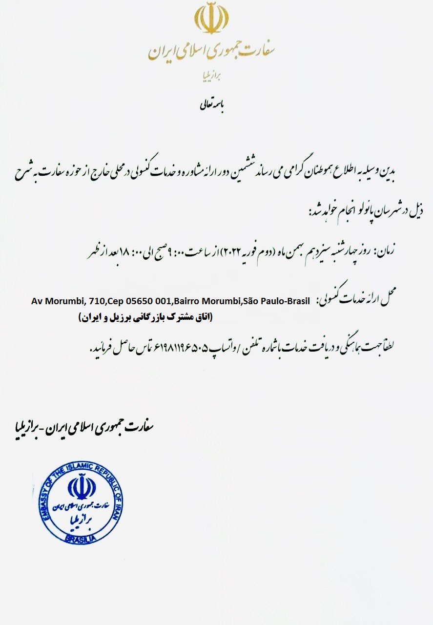 بدین وسیله به اطلاع ایرانیان و هموطنان گرامی می رساند ششمین دور ارائه مشاوره و خدمات کنسولی در محلی خارج از سفارت در شهر سان پائولو ارائه خواهد شد: