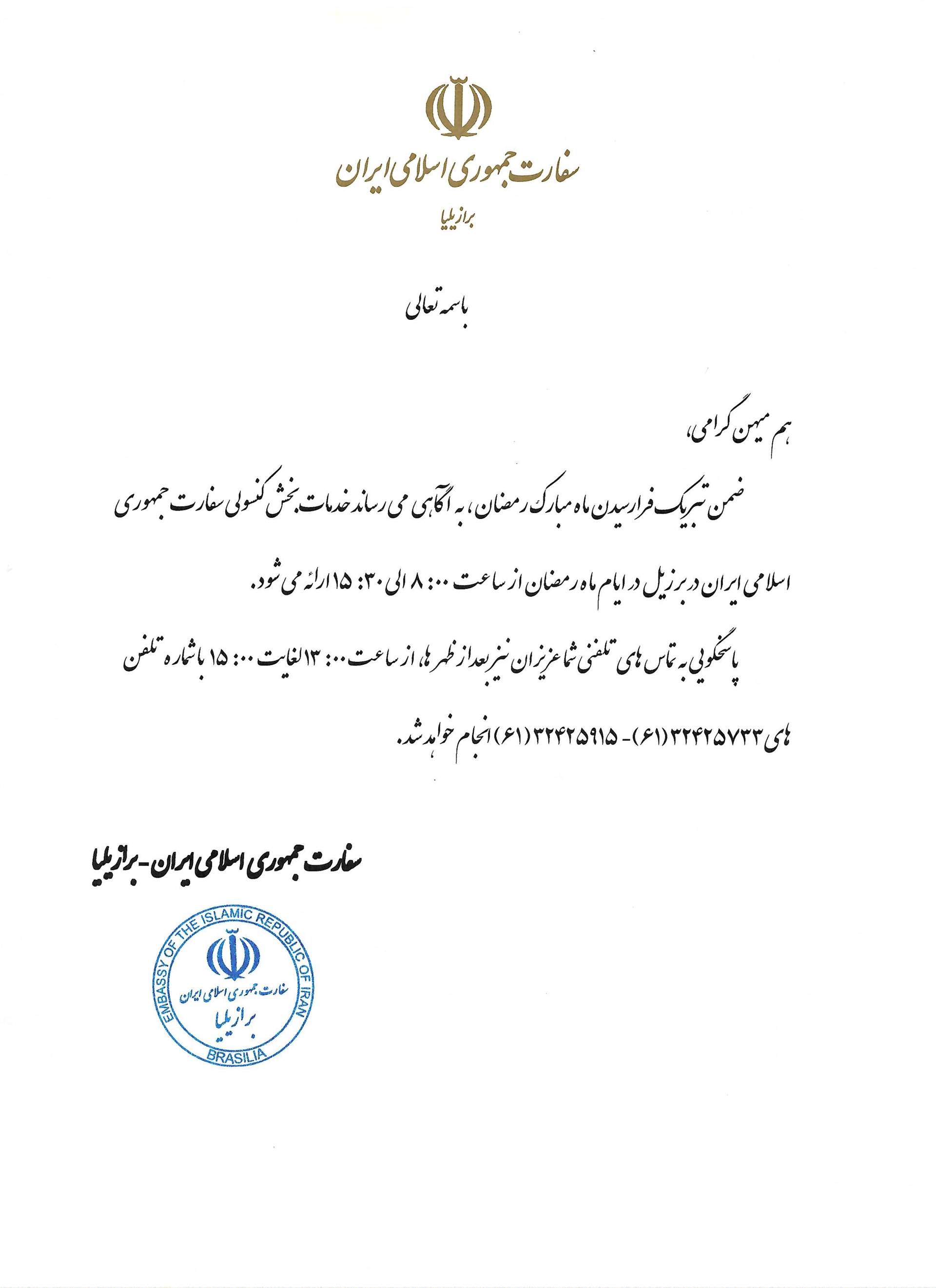 با تبریک فرارسیدن ماه مبارک رمضان، ساعات کاری نمایندگی جمهوری اسلامی ایران در برزیل در این ایام تغییر می نماید.