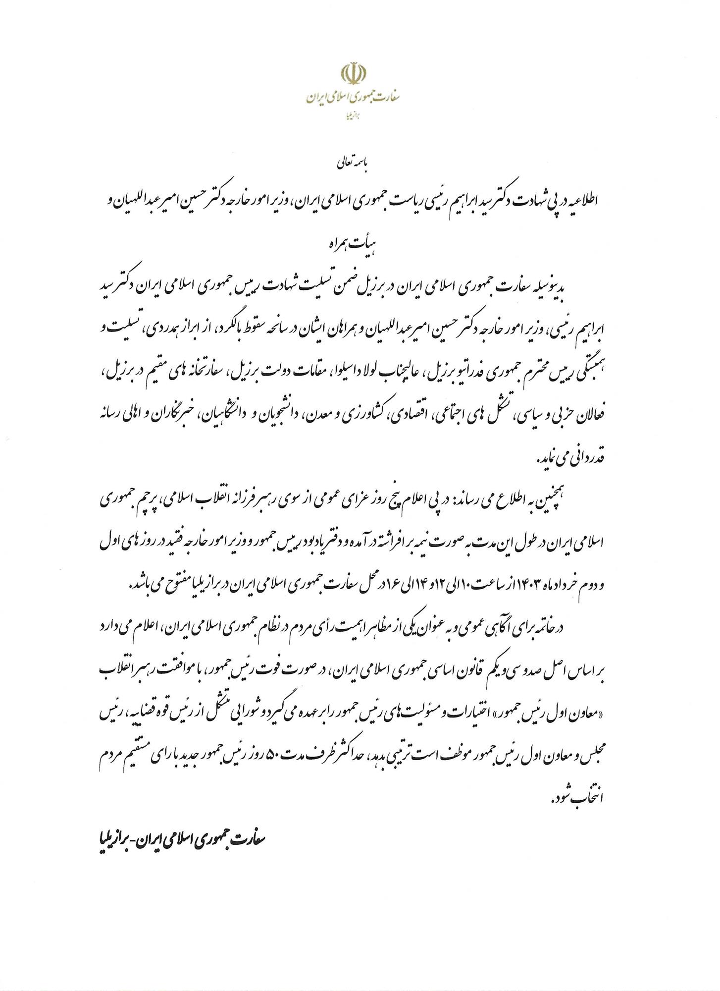 همچنین به اطلاع می رساند: در پی اعلام پنج روز عزای عمومی از سوی رهبر فرزانه انقلاب اسلامی، پرچم جمهوری اسلامی ایران در طول این مدت به صورت نیمه بر افراشته در آمده و دفتر یادبود رییس جمهور و وزیر امور خارجه فقید در روز های اول و دوم خرداد ماه 1403 از ساعت 10 الی 12 و 14 الی 16 در محل سفارت جمهوری اسلامی ایران در برازیلیا مفتوح میباشد.