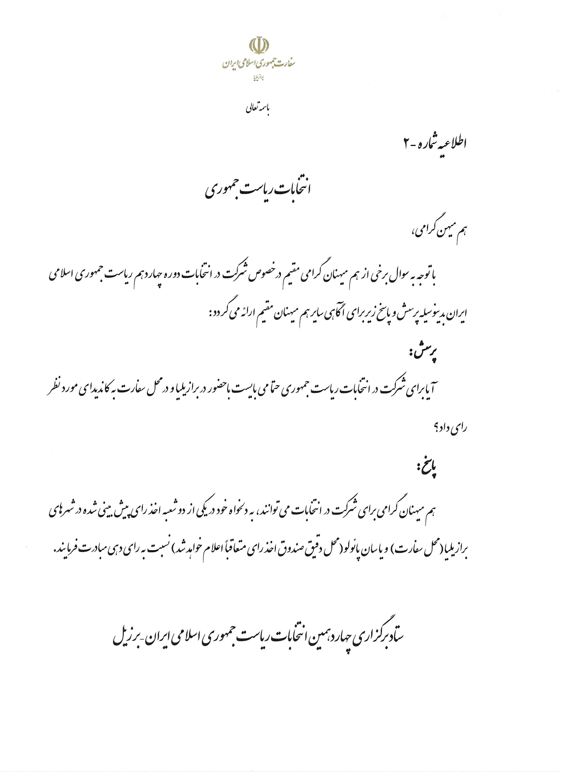 هم میهنان گرامیبرای شرکت در انتخابات میتوانند، به دلخواه خود در یکی از دو شعبه اخذ رای پیش بینی شده در شهرهای برازیلیا( محل سفارت) و یا سان پائولو( محل دقیق صندوق اخذ رای متعاقباً اعلام خواهد شد) نسبت به رای دهی مبادرت فرمایند.