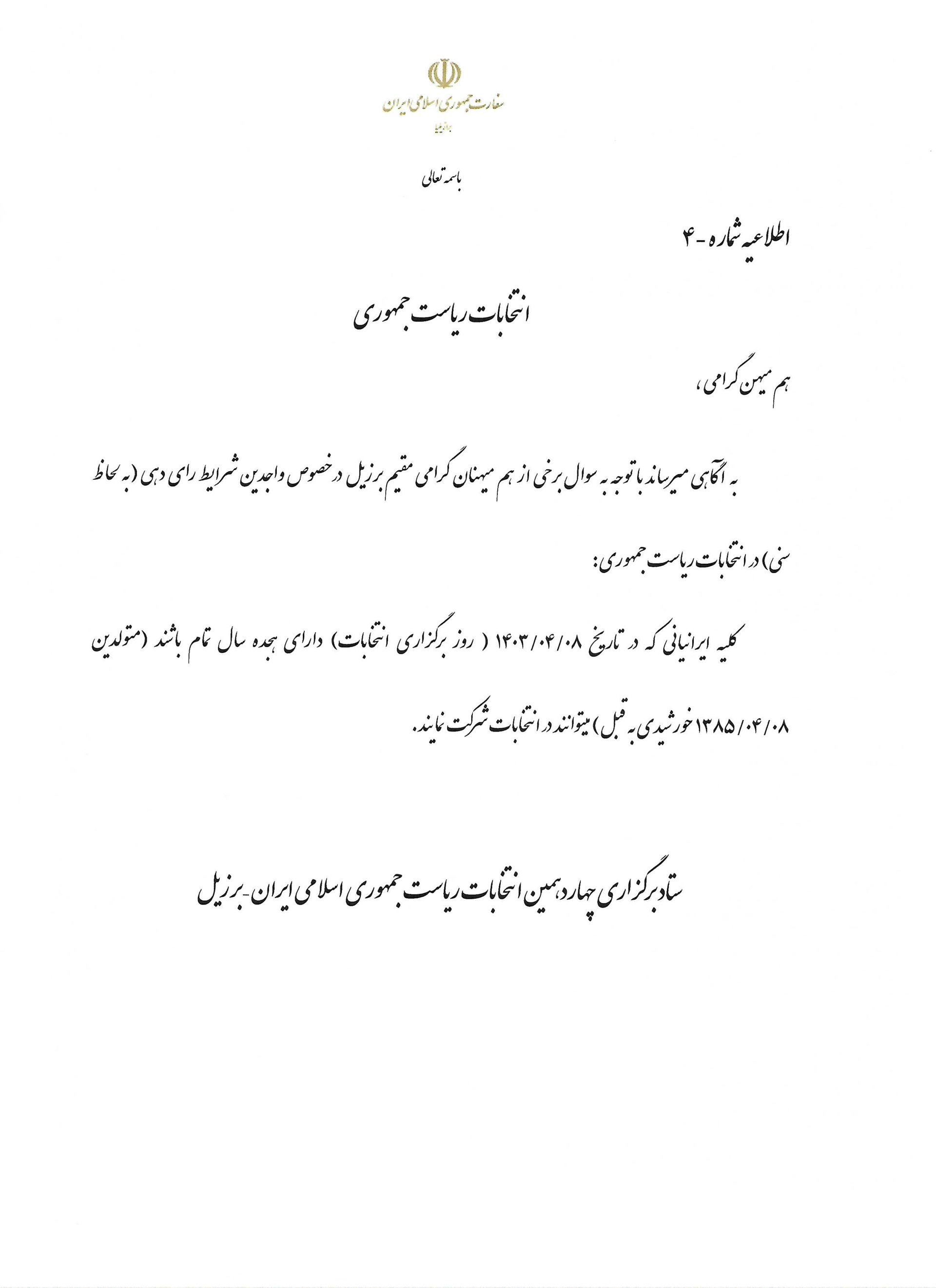 به آگاهی میرساند با توجه به سوال برخی از هم میهنان گرامی مقیم برزیل در خصوص واجدین شرایط رای دهی (به لحاظ سنی) در انتخابات ریاست جمهوری: