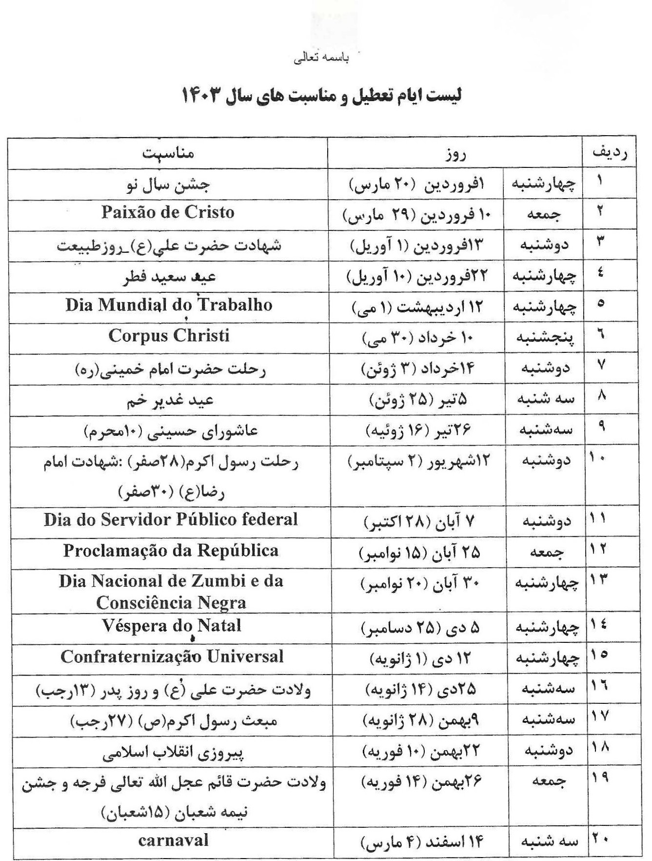 ضمناً تعطیلات نمایندگیهای خارج از کشور جمهوری اسلامی ایران تابعی از تعطیلات رسمی محل و کشورمان است.